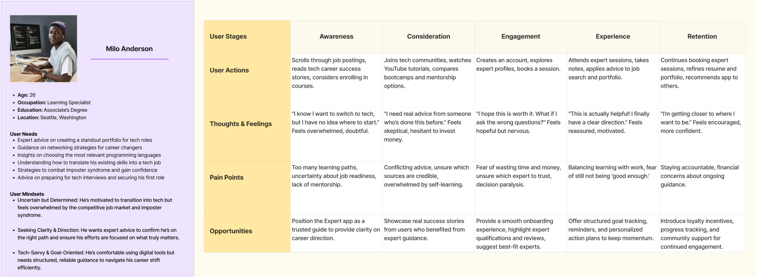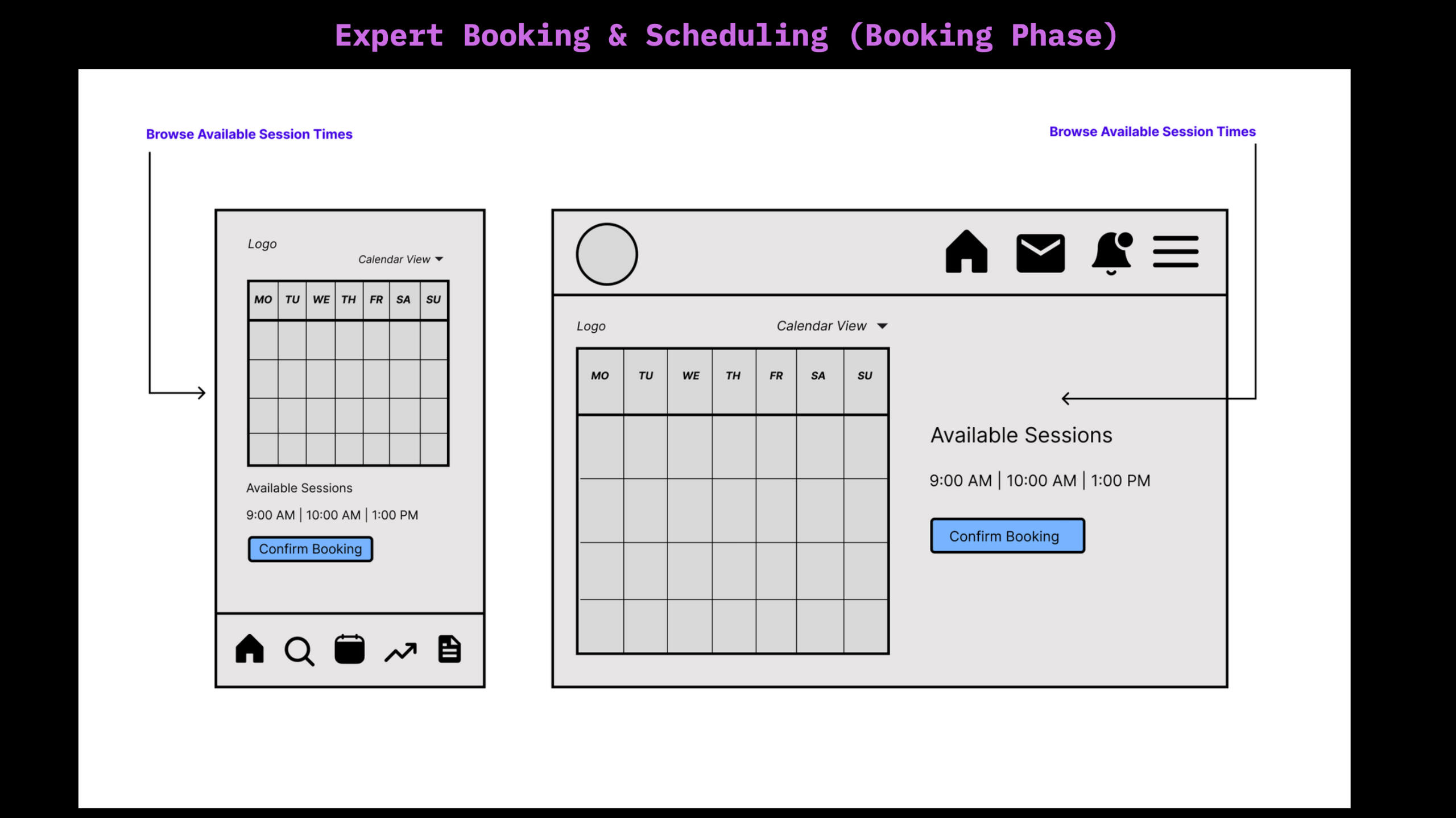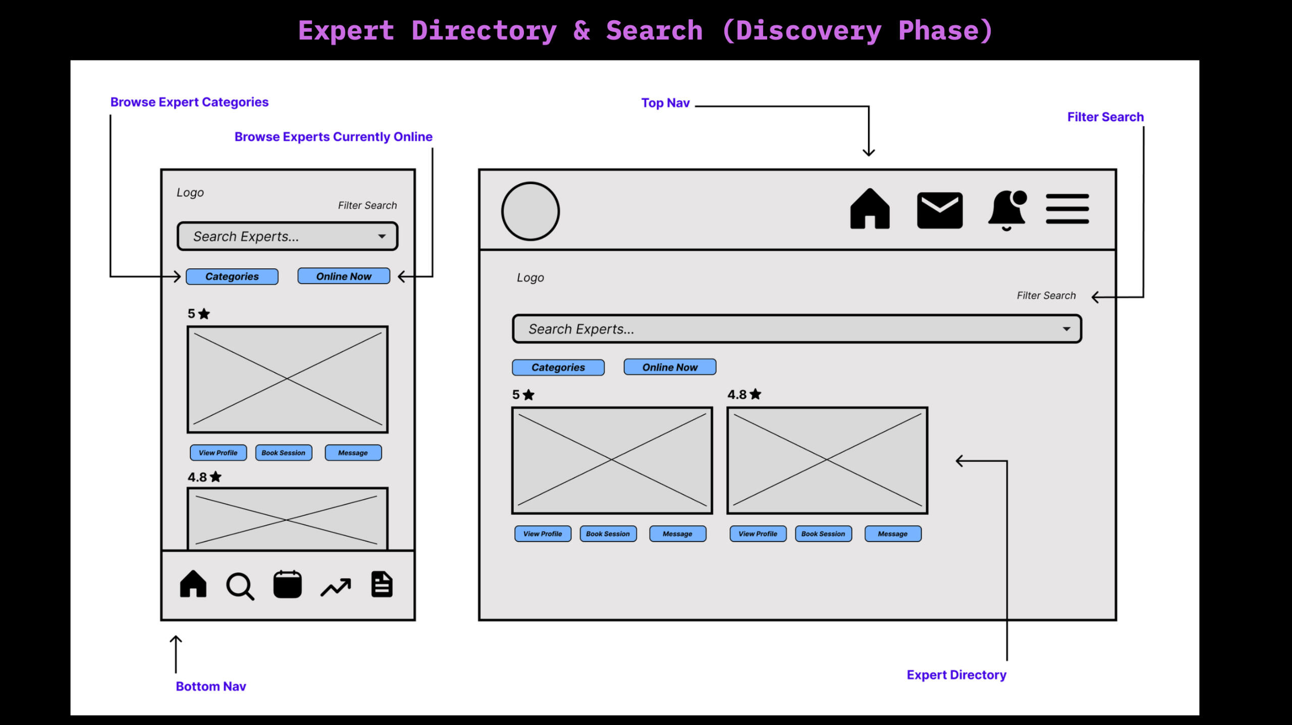 • User Personas: Created 2 primary personas (Milo & Nova) to capture emotional and functional needs• Competitive Analysis: Analyzed competitors to identify gaps in expert connection and user onboarding• User Flows: Built task flows for expert search, booking, and session check-ins• Wireframes: Sketched mobile and desktop layouts for key features like onboarding, expert directory, booking flow, and dashboard• Prototyping: Designed clickthroughs in Figma