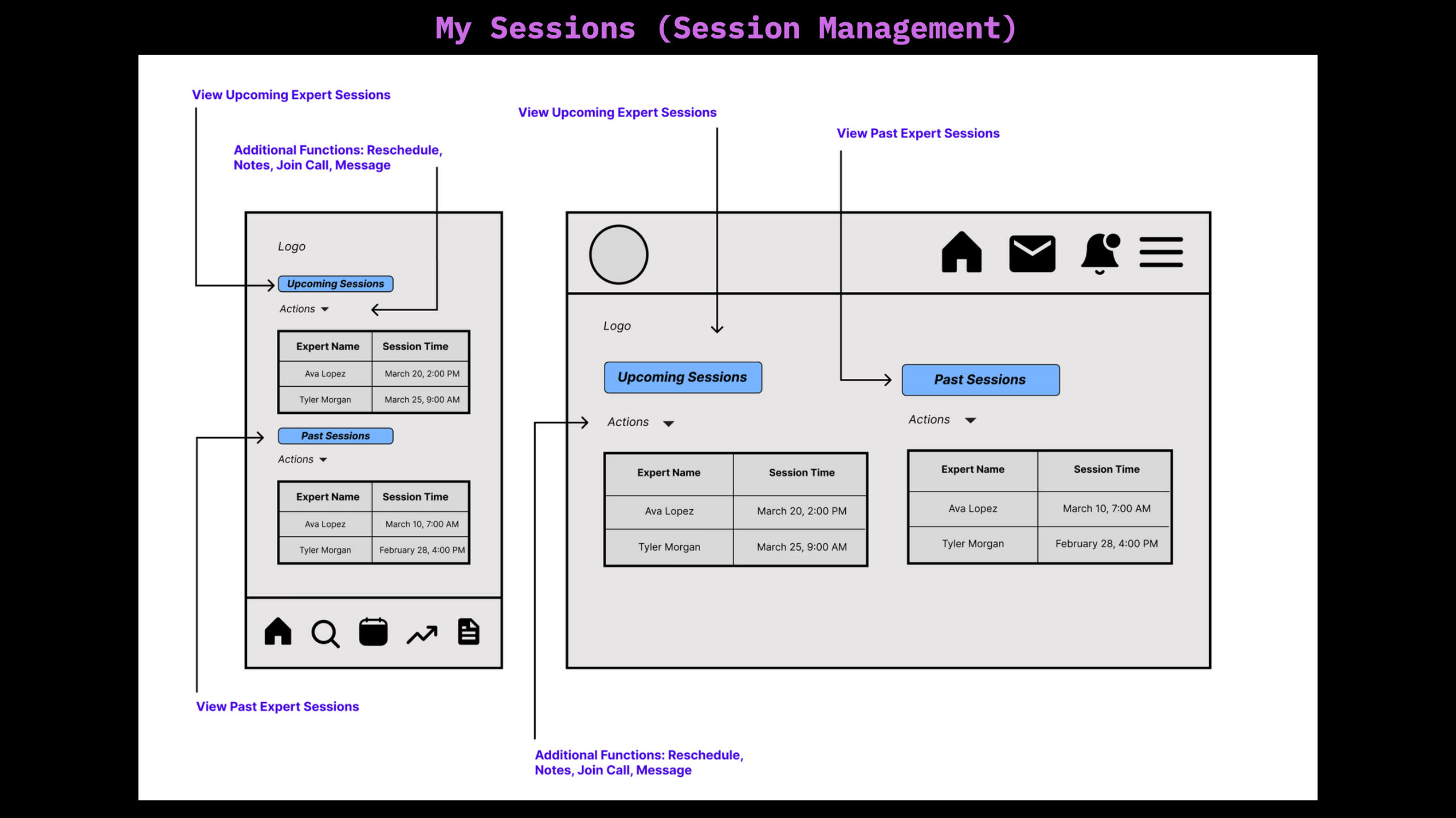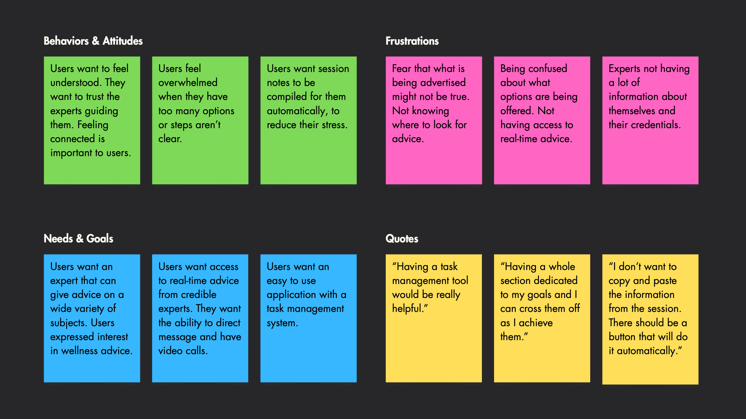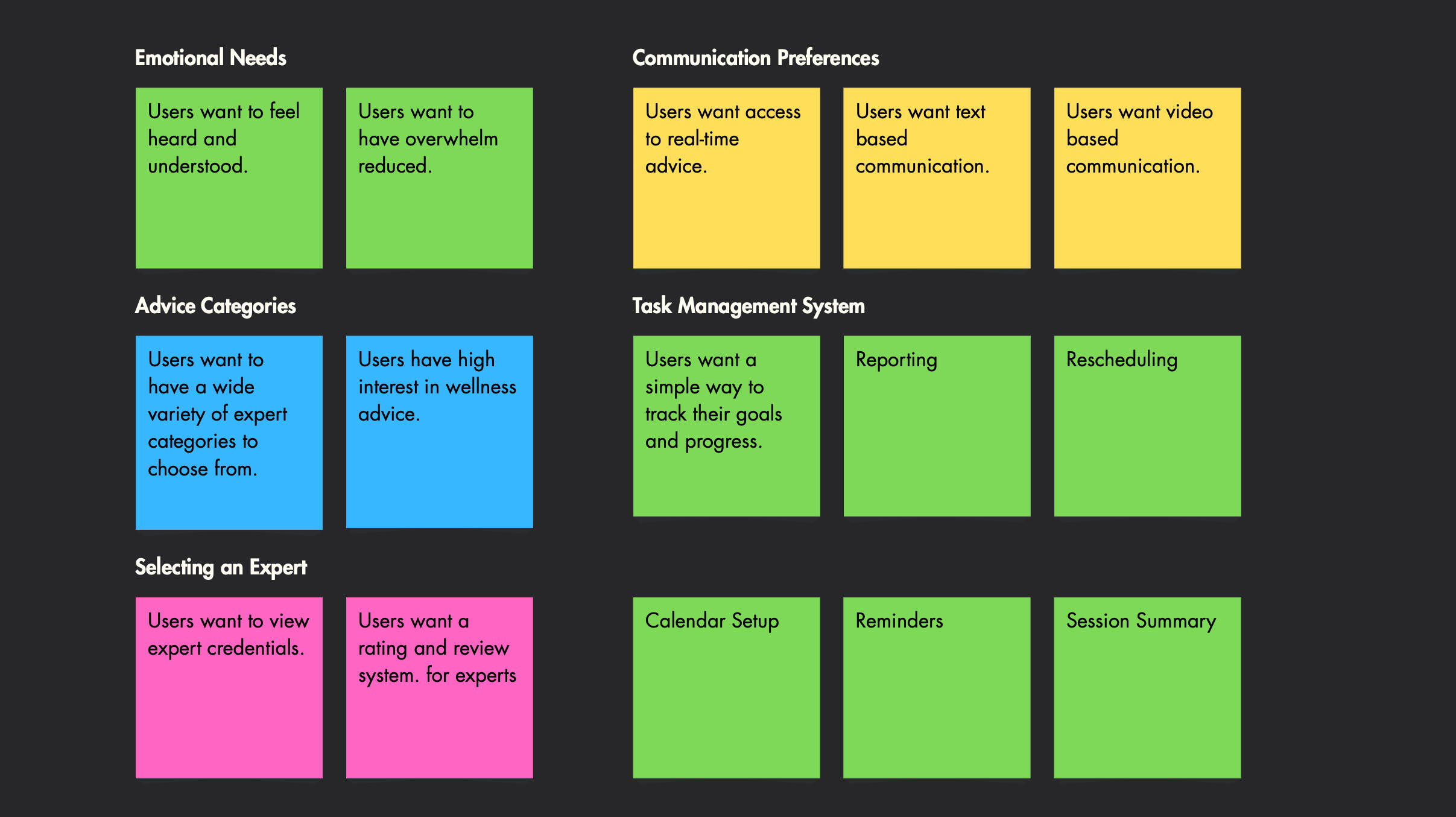 • User Personas: Created 2 primary personas (Milo & Nova) to capture emotional and functional needs• Competitive Analysis: Analyzed competitors to identify gaps in expert connection and user onboarding• User Flows: Built task flows for expert search, booking, and session check-ins• Wireframes: Sketched mobile and desktop layouts for key features like onboarding, expert directory, booking flow, and dashboard• Prototyping: Designed clickthroughs in Figma