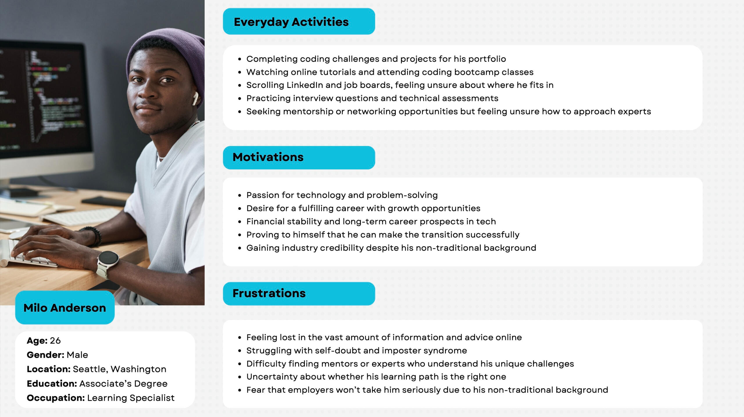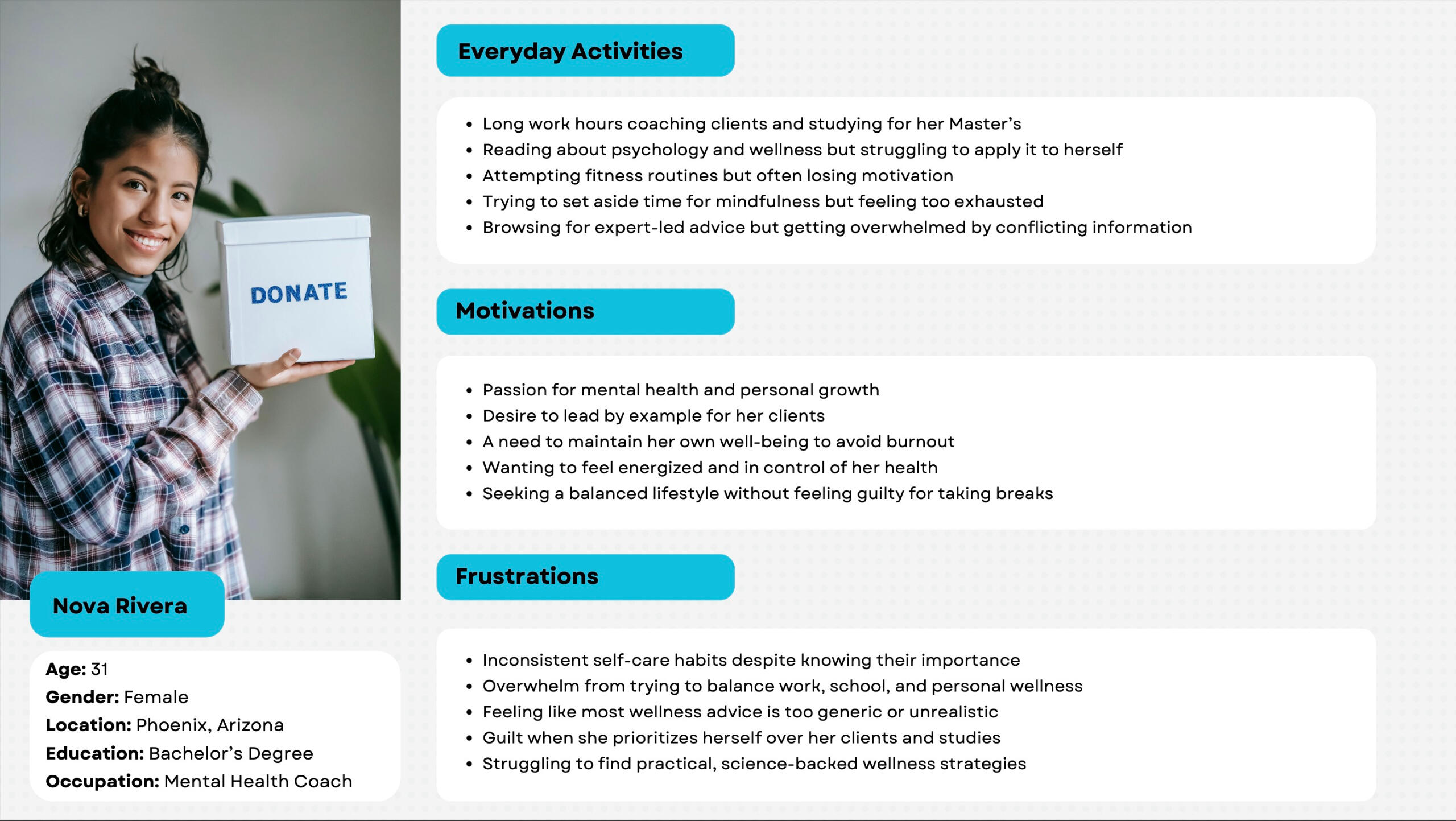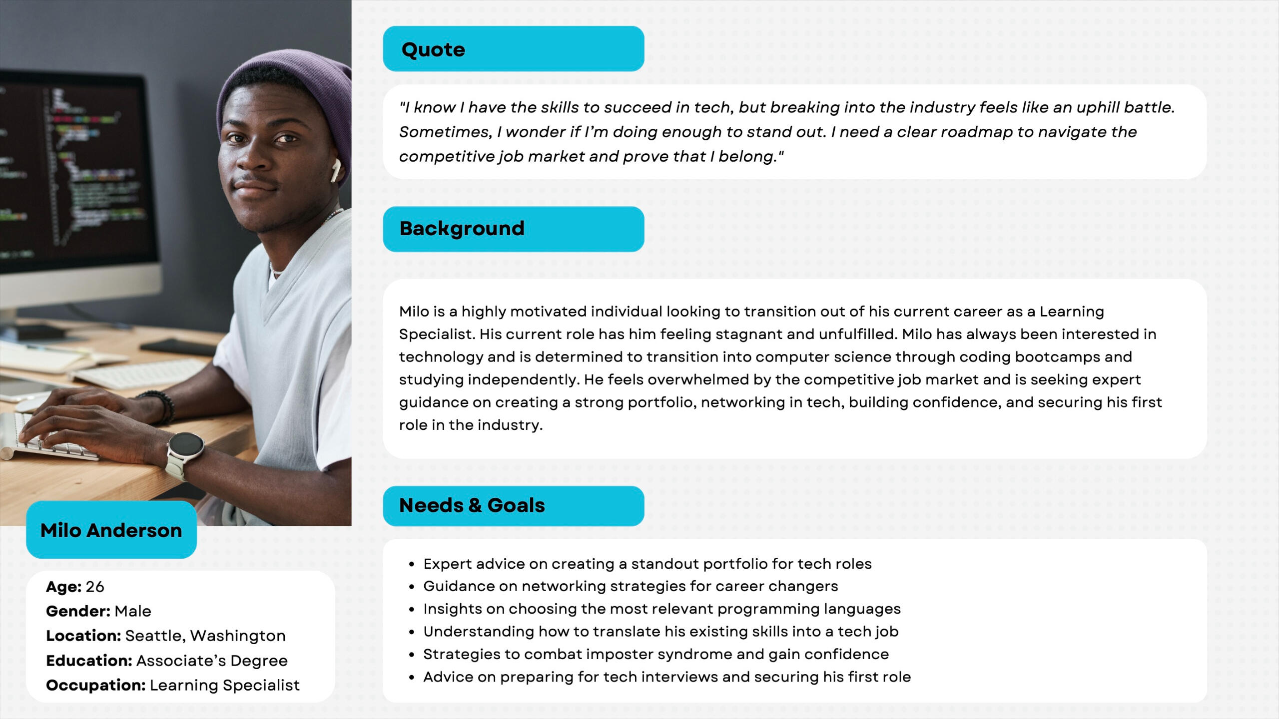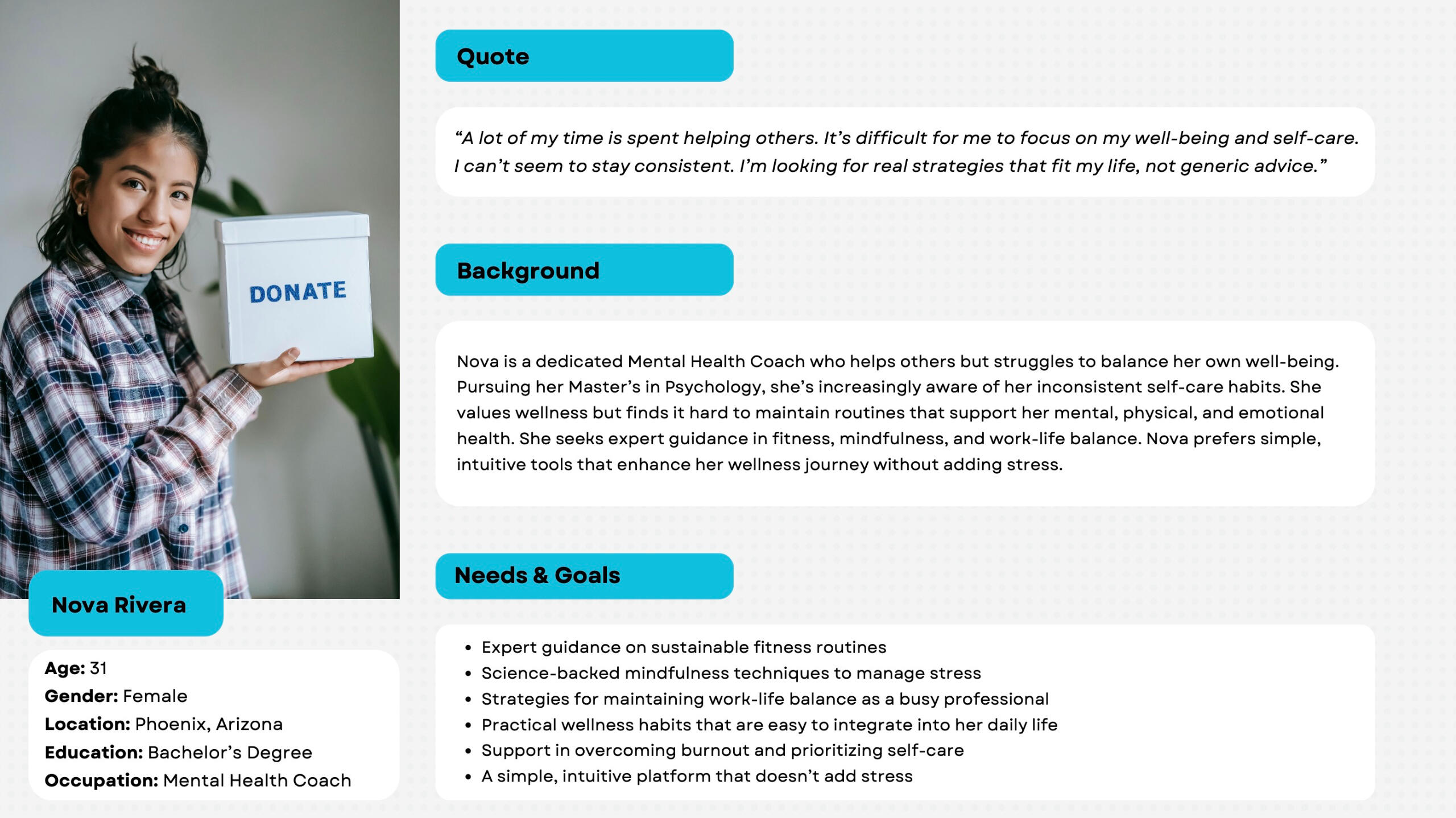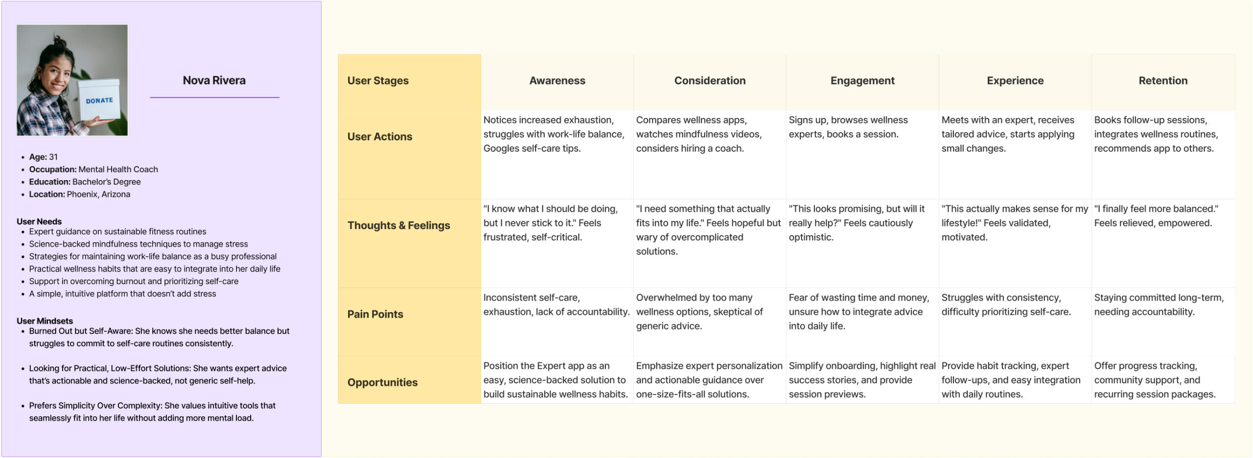 • Focused on reducing cognitive load for users• Added custom tools for each persona (Milo = job tracker, Nova = wellness reflection journal)